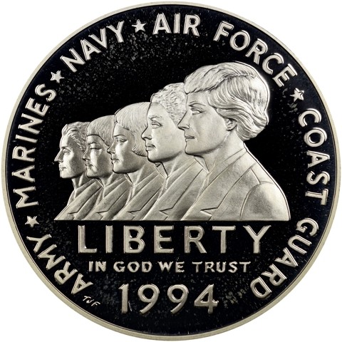 The obverse of the coin features a profile view of servicewomen in the Army, Marine Corps, Navy, Air Force, and Coast Guard. The inscriptions include “Army * Marines * Navy * Air Force * Cost Guard” with each separated by a single star. Remaining inscriptions are “Liberty”, “In God We Trust”, and the date “1994”.