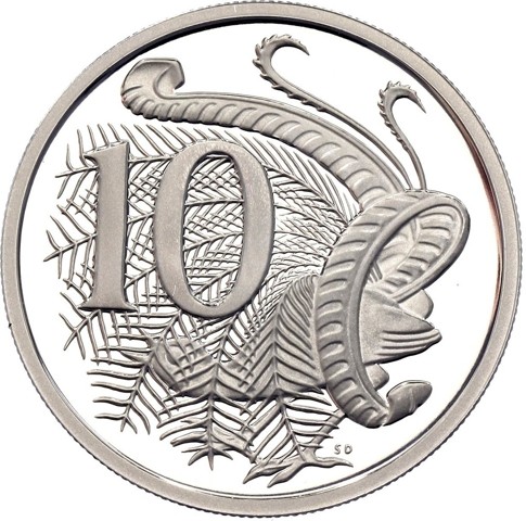 The reverse depicts a lyrebird seen facing left, with its tail plumes expanded forward over its head. The denomination numeral 10 is above the head of the bird; in tiny letters initials of designer (SD)below, in the right field beside its foot.