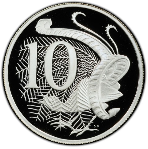 The reverse depicts a lyrebird seen facing left, with its tail plumes expanded forward over its head. The denomination numeral 10 is above the head of the bird; in tiny letters initials of designer (SD)below, in the right field beside its foot.