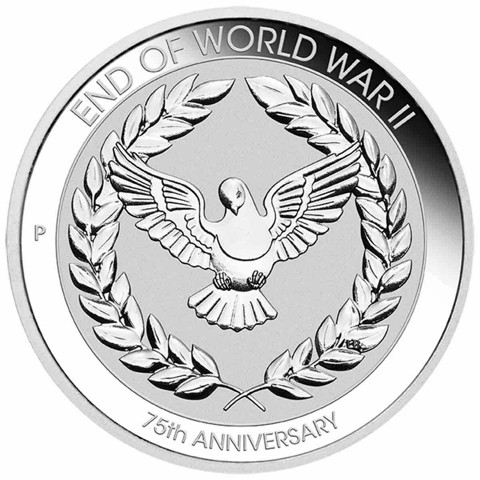 The reverse depicts a dove surrounded by a wreath. Around above, the inscription END OF WORLD WAR II; around below, 75th ANNIVERSARY. The Perth Mint's traditional P mint mark is on the left. The designer's initials LB are in tiny letters below right, on the leaves of the wreath.