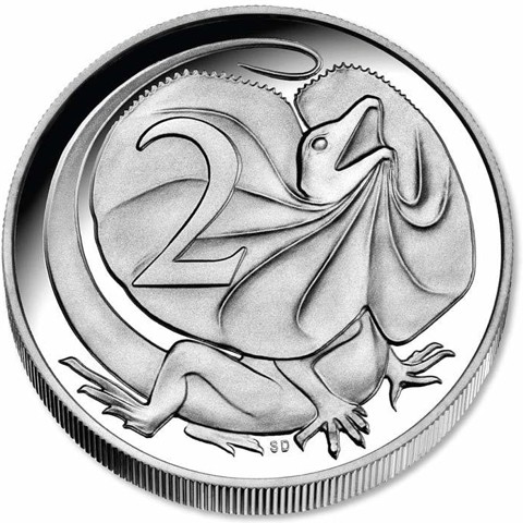 The reverse features a frilled-neck lizard with neck frill extended and mouth open, designed and sculpted by Stuart Devlin. The denomination numeral 2 [cents] is left of the lizard's head; below its body in tiny letters initials of designer (SD).
