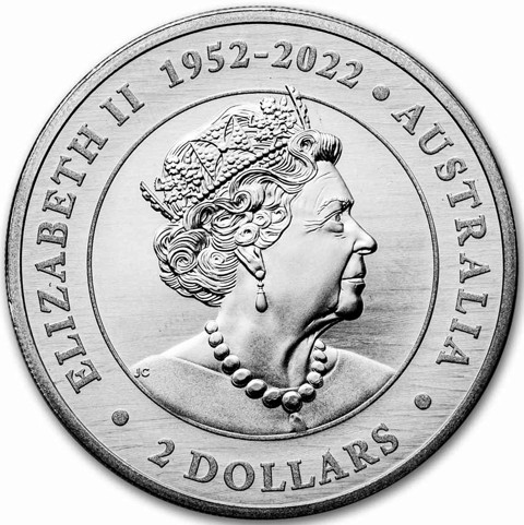 6th crowned portrait of HM Queen Elizabeth II facing right (the Commonwealth effigy), wearing the George IV State Diadem, the Coronation Necklace and Earrings framed by inscriptions “ELIZABETH II,” "the dates of the Queen's reign 1952 - 2022," “AUSTRALIA, 2023.”
