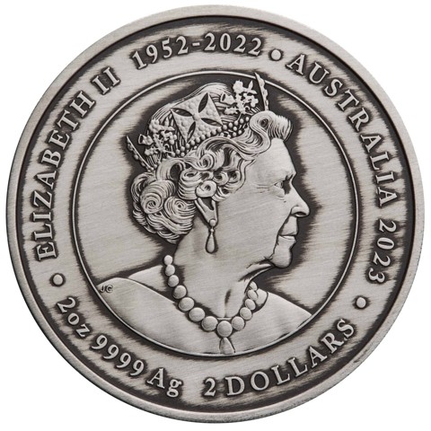 6th crowned portrait of HM Queen Elizabeth II facing right (the Commonwealth effigy), wearing the George IV State Diadem, the Coronation Necklace and Earrings framed by inscriptions “ELIZABETH II,” "the dates of the Queen's reign 1952 - 2022," “AUSTRALIA, 2023,” above, weight, purity, and metal content "2oz 9999 Ag" and the face value "2 DOLLARS."