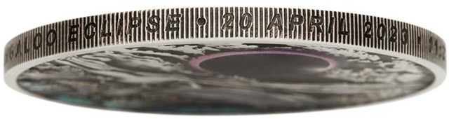The coin’s reverse portrays colored corals of the Ningaloo Reef and as a majestic whale shark swims through the water, the world’s largest fish, Up above, the 2023 Ningaloo Total Solar Eclipse as it casts a shadow across the sky. The Sun appears black, with a thin colored halo around it. In the left field, The Perth Mint’s traditional ‘P’ Mint Mark appears above and the designer's initials (SR) at the opposite side.
