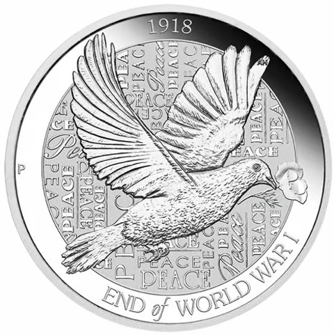 The coin’s reverse portrays a dove, which has become an international symbol of peace. In its beak, the bird is carrying a poppy flower, another poignant symbol. Red poppies were the first flowers to bloom in the devastated battlefields of Western Europe and are now linked with European remembrance ceremonies of World War I. Behind the dove, the word “peace” is written in different fonts. On top of the coin, the inscription: "1918" - the year of the war. On the bottom, the inscription: "END OF WORLD WAR I" - the name of the coin. In the left field, The Perth Mint's traditional "P" mint mark and the designers initials “AH” feature in the upper feather of dove's wing.