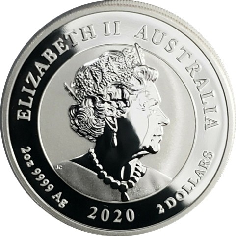 6th crowned portrait of HM Queen Elizabeth II facing right (the Commonwealth effigy), wearing the George IV State Diadem, the Coronation Necklace and Earrings framed by inscriptions “ELIZABETH II,” “AUSTRALIA,” above, weight, purity, and metal content "2oz 9999 Ag" and 2 DOLLARS, and the coin's mintage year, "2020" below.