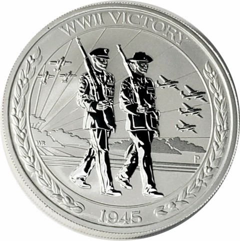 The reverse of the coin captures the essence of victory and the subsequent global sigh of relief, depicts an ANZAC soldier wearing Slouch hat and an officer in Uniforms marching holding rifles, with several aircraft flying and radiant sun rising behind the clouds in the background within a circle. The inscription ‘WWII VICTORY" around above and the date "1945’ around below. The Perth Mint’s ‘P’ mintmark is also included in the design can be found on the right-hand side, with the initials of the designer (NM) appearing at the opposite, on the clouds.