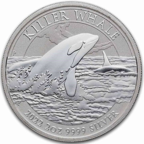 depiction of a dynamic image of two killer whales (orcas) swimming through the crisp ocean waters. The killer whale in the foreground is depicted breaching the surface of the water, while the killer whale in the background is shown with only its dorsal fin cresting the surface of the water, illustrated with motion that almost brings them to life. The design also includes a peaceful marine background. Engravings on this face of the coin identify the name of the coin "KILLER WHALE" around above and the year of issue, weight, purity, and metal content "2022 2oz 9999 SILVER" are inscribed close to the bottom rim. In the left field, The Perth Mint's traditional "P" mint mark appears and the designers initials “NH” appearing just under.