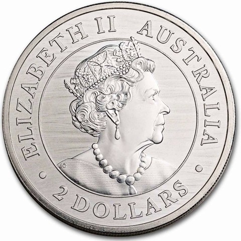6th crowned portrait of HM Queen Elizabeth II facing right (the Commonwealth effigy), wearing the George IV State Diadem, the Coronation Necklace and Earrings framed by inscriptions “ELIZABETH II,” “AUSTRALIA,” and the face value “2 DOLLARS.”