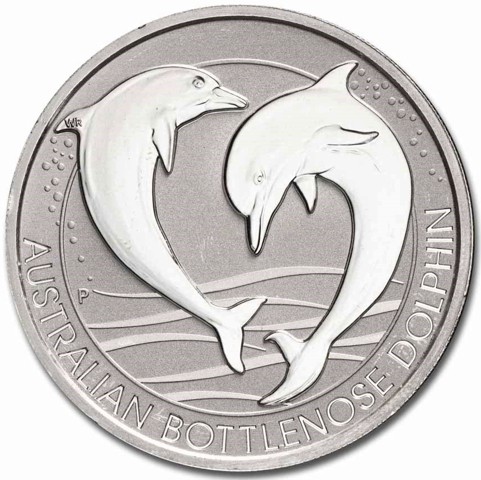 The reverse of the coin features a stunning pair of playful bottlenose dolphins leaping above stylized waves. Engravings on this face of the coin identify the name of the series "AUSTRALIAN BOTTLENOSE DOLPHIN" inscribed close to the bottom rim. In the left field, the Perth Mint's 'P' mintmark appears and the designer's initials "WR" in tiny letters above left, on the dolphin's left flipper.