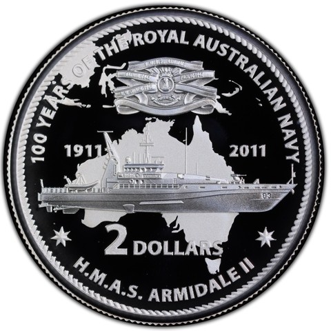Within a roped-shape circle the reverse depicts a richly detailed image of HMAS Armidale II, a patrol boat commissioned in 2005, routinely involved in boarder protection duties, in the middle. The upper half of the design captures the battle honors of it (DARWIN 1942, PACIFIC 1942, and NEW GUINEA 1942) within a ribbon and emblem of HMAS Armidale II and The lower half of the design the face value "2 DOLLARS" against the map of Australia where the battles occurred in the background. The inscription "100 YEARS OF THE ROYAL AUSTRALIAN NAVY" around above - the coin name - and the submarine name "H.M.A.S. ARMIDALE II" around below. The dates "1911 - 2011" are inscribed on both sides.