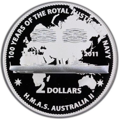 Within a roped-shape circle the reverse depicts a richly detailed image of HMAS Australia II, a county class heavy cruiser commissioned in 1928, in the middle. The upper half of the design captures the battle honors of it (BABUL 1914 NORTH SEA 1916-19, ATLANTIC 1940-41, PACIFIC 1941-43, CORAL SEA 1942, SAVO ISLAND 1942 GUADALCANAL 1942, NEW GUINEA 1942-44 LEYTE GULF 1944, LINGAYEN GULF 1945) within a ribbon and emblem of HMAS Australia II and The lower half of the design the face value "2 DOLLARS" against the map of "Afro-Eurasia" and Australia where the battles occurred in the background. The inscription "100 YEARS OF THE ROYAL AUSTRALIAN NAVY" around above - the coin name - and the submarine name "H.M.A.S. AUSTRALIA II" around below. The dates "1911 - 2011" are inscribed on both sides.