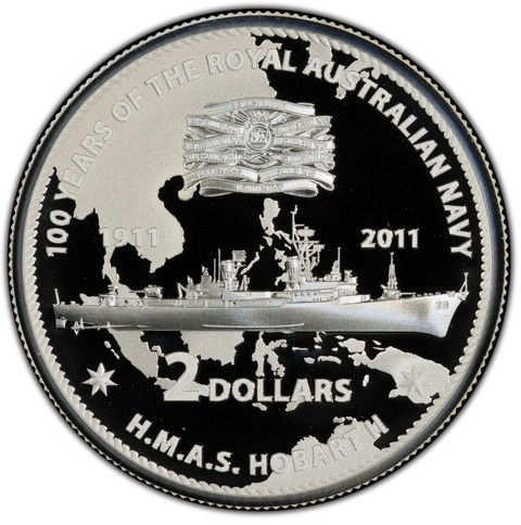 Within a roped-shape circle the reverse depicts a richly detailed image of HMAS Hobart II, an Adams class guided missile destroyer ordered for the Royal Australian Navy in the 1960s, in the middle. The upper half of the design captures the battle honors of it (EAST INDIES 1940, INDIAN OCEAN 1941, MEDITERRANEAN 1941, CORAL SEA 1942, SAVO ISLAND 1942, GUADALCANAL 1942, PACIFIC 1942-45, BORNEO 1945, and VIETNAM 1967-70) within a ribbon and emblem of HMAS Hobart II and The lower half of the design the face value "2 DOLLARS" against the map of "Afro-Eurasia" and Australia where the battles occurred in the background. The inscription "100 YEARS OF THE ROYAL AUSTRALIAN NAVY" around above - the coin name - and the submarine name "H.M.A.S. HOBART II" around below. The dates "1911 - 2011" are inscribed on both sides.