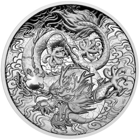 A coiled dragon is found in the reverse design of the coin. The coiled dragon fearsome appearance comprising a scaly body, eagle-like talons and horned head with demonic eyes and is shown amidst the clouds, denoting the dragon's celestial realm. The beast clutching a flaming pearl in its claws. There are two inscriptions on this side of the coin that include the NM initials of Natasha Muhl and the P mint mark of the Perth Mint.