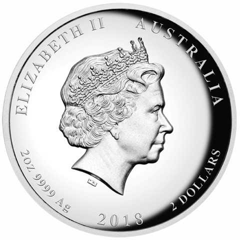 6th crowned portrait of HM Queen Elizabeth II facing right (the Commonwealth effigy), wearing the George IV State Diadem, the Coronation Necklace and Earrings framed by inscriptions “ELIZABETH II,” “AUSTRALIA,” above, weight, purity, and metal content "2oz 9999 Ag" and 2 DOLLARS, and the coin's mintage year, "2018" below.
