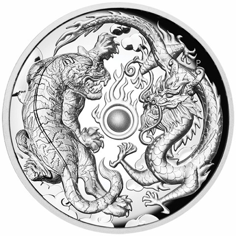 The reverse features the image of a dragon and tiger circling a flaming pearl. the pursuit of which represents the desire for infinite wisdom. Within the concept of feng shui, the dragon and tiger combined together represent perfect balance, The tiger represents the female energy of yin, while the dragon represents the male or yang. In the right field, The Perth Mint’s traditional ‘P’ Mint Mark appears and the designer's initials (TV) below left on the tiger 's left hind foot.