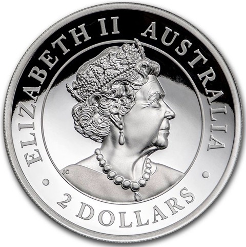 6th crowned portrait of HM Queen Elizabeth II facing right (the Commonwealth effigy), wearing the George IV State Diadem, the Coronation Necklace and Earrings framed by inscriptions “ELIZABETH II,” “AUSTRALIA,” and the face value “2 DOLLARS.”