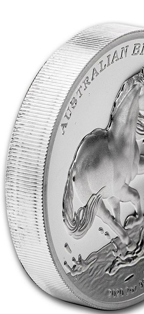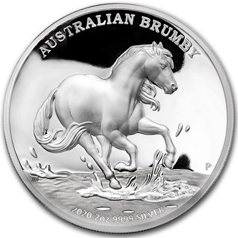 The coin’s reverse portrays the brumby as a magnificent, unfettered beast, galloping with abandon through water. Engravings on this face of the coin identify the name of the series "AUSTRALIAN BRUMBY" around above, the year of issue, weight, purity, and metal content "2020 2 oz 9999 FINE SILVER" are inscribed close to the bottom rim. In the right field, The Perth Mint’s ‘P’ mintmark appears and the the designer's initials (JM) are also incorporated into the design at the opposite on the water surface.
