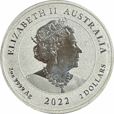 6th crowned portrait of HM Queen Elizabeth II facing right (the Commonwealth effigy), wearing the George IV State Diadem, the Coronation Necklace and Earrings framed by inscriptions “ELIZABETH II,” “AUSTRALIA,” weight, purity, and metal content "2oz 9999 Ag" and 2 DOLLARS, and the coin's mintage year, "2022" below.