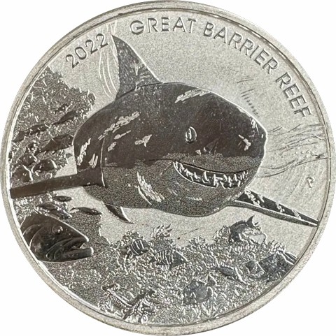 The reverse field of the coin, features the horrifying image of a Great White in the foreground, swimming through the Great Barrier Reef with minor fish and marine vegetation in the background. The massive shark is breaking the surface of the water as it moves to its prey. The most terrifying part of the design is the presence of its razor-sharp teeth. These teeth allow the aggressive predators to tear into victims and rip off large chunks. Engravings on this face of the coin identify the name of the series accompanied by the date "2022 GREAT BARRIER REEF" inscribed close to the upper rim. In the right field, The Perth Mint's traditional "P" mint mark appears and the designers initials “WR” appearing at the opposite.