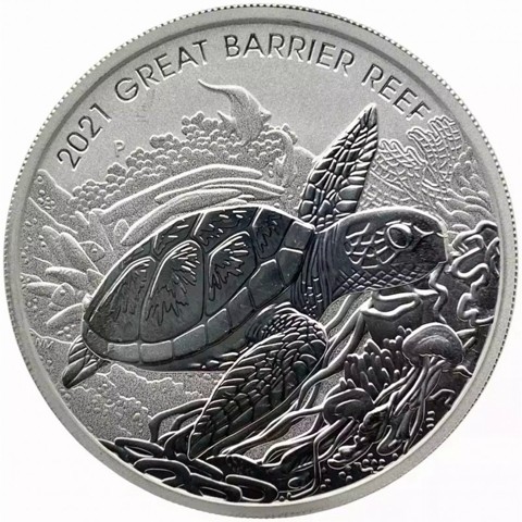 The reverse of the coin shows a beautifully detailed Hawksbill sea turtle in the foreground, gliding through the entire Great Barrier Reef area which feeds and nests throughout it. In the background, vibrant coral reefs, capturing jellyfish, an angelfish and dozens of different types of corals and marine plants rendered in exquisite detail. The Perth Mint 'P' mint mark can be found on the left-hand side, with the initials of the designer (NM) appearing just under, behind the turtle.