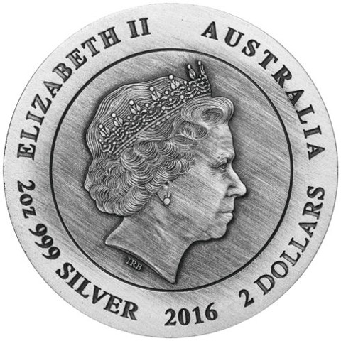 Fourth crowned portrait of HM Queen Elizabeth II facing right, wearing the Girls of Great Britain and Ireland tiara framed by inscriptions “ELIZABETH II,” “AUSTRALIA,” above, weight, purity, and metal content "2 oz 9999 SILVER " and 2 DOLLARS, and the coin's mintage year, "2016" below.