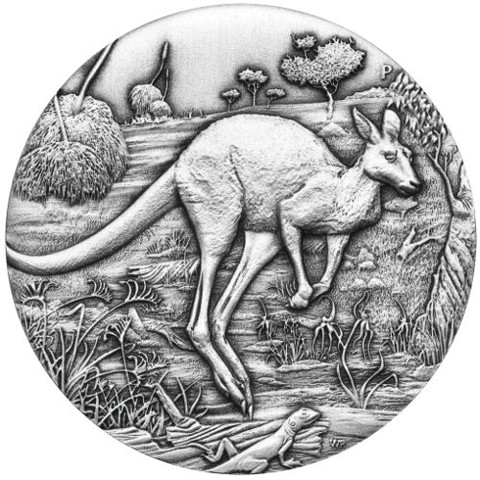 The reverse of the coin depicts a kangaroo hopping across the Australian landscape with with intricate details of its surroundings. This includes a small lizard resting on a rock in the foreground. The design also includes The Perth Mint's "P" mintmark above right and the designer's initials "WR" in tiny letters below right, next to the lizard.
