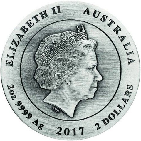 Fourth crowned portrait of HM Queen Elizabeth II facing right, wearing the Girls of Great Britain and Ireland tiara framed by inscriptions “ELIZABETH II,” “AUSTRALIA,” above, weight, purity, and metal content "2 oz 9999 SILVER " and 2 DOLLARS, and the coin's mintage year, "2017" below.