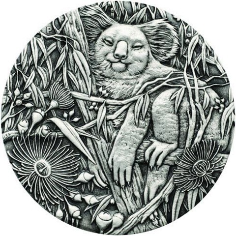 The reverse of the Koala Coin depicts the image of a koala as it rests in in a eucalyptus tree surrounded by gumnuts, gum leaves and gum blossoms. It has a calm, relaxed look on its face as though it already has a belly full of food. The design also includes The Perth Mint's "P" mintmark above left and the designer's initials "JM" in tiny letters at the left side.