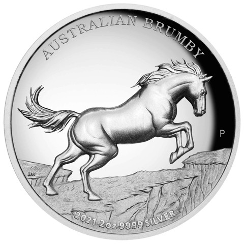 On the reverse of the coin, the image of a mighty brumby. The wild magnificent horse is showcasing its power as it rears up on its hind legs. The horse is standing amidst a steep rocky outcrop. Engravings on this face of the coin identify the name of the series "AUSTRALIAN BRUMBY" around above, the year of issue, weight, purity, and metal content "2021 2oz 9999 FINE SILVER" are inscribed close to the bottom rim. In the right field, The Perth Mint’s ‘P’ mintmark appears and the the designer's initials (JM) are also incorporated into the design at the opposite on the ground.