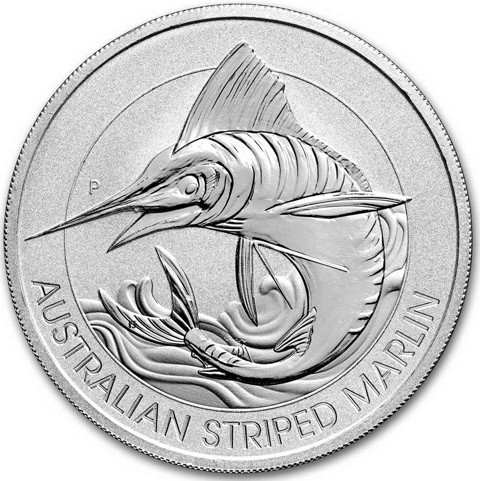 The reverse of the coin captures a dynamic portrayal of striped marlin breaching the water. Its long bill extends forward, while the tall dorsal fin rises prominently from its back. The vertical striping along the body is clearly defined, and the overall design highlights the speed and strength of this well-known ocean species with careful attention to anatomical accuracy in the fish’s elongated bill, streamlined form, and detailed fins. Engravings on this face of the coin identify the name of the series "AUSTRALIAN STRIPED MARLIN" inscribed close to the bottom rim. In the left field, The Perth Mint’s ‘P’ mintmark appears and the designer's initials (IJ) are also incorporated into the design below mintmark , on the tail fin.