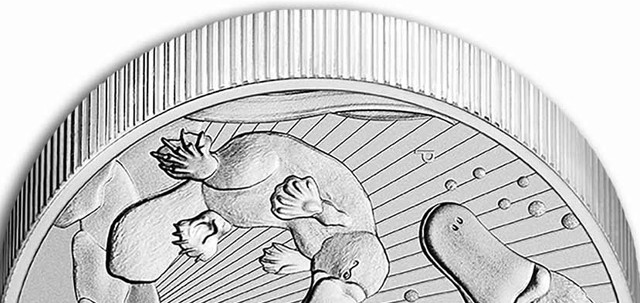 The reverse showcases a beautifully detailed depiction of a platypus gliding underwater, surrounded by swirling currents and bubbles that emphasize the animal’s movement and aquatic environment. The platypus is rendered in fine detail, highlighting its distinctive bill, webbed feet, and textured fur against radial lines in the backdrop. In the right field, The Perth Mint's traditional "P" mint mark appears below and the designers initials “MR” feature at the bottom.
