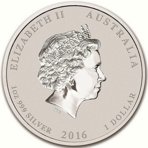 Fourth crowned portrait of HM Queen Elizabeth II facing right, wearing the Girls of Great Britain and Ireland tiara. surrounded by the inscriptions “ELIZABETH II, AUSTRALIA, face value "2 DOLLAR" – date "2016," metal, purity and weight "2oz 999 SILVER.”