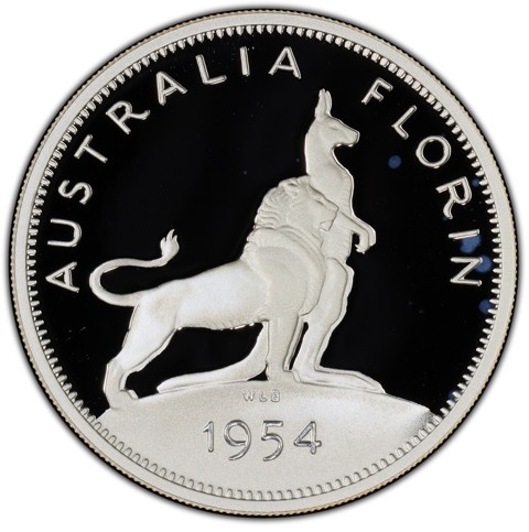 The reverse depicts a lion and a kangaroo standing together on a curved ground line facing right; around above, AUSTRALIA FLORIN; below in exergue, the date 1954. The designer's initials WLB are in the ground below the front foot of the lion.