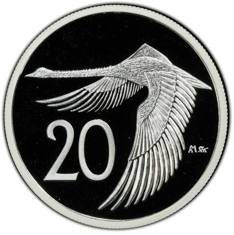 The reverse features black swan in flight. The numeral face value 20 below. letters initials of designer (AM) in lower right.