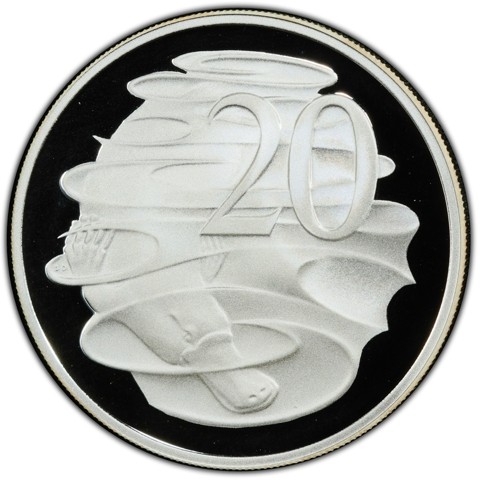 The reverse depicts a platypus swimming. The denomination numeral 20 is above the head of the animal; the designer 's initials SD are in tiny letters, within the swirl of water around its right forepaw.