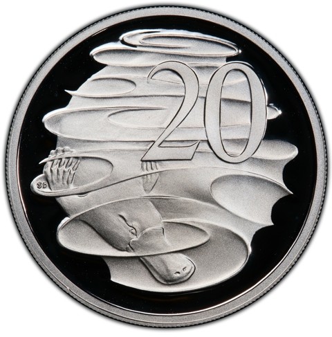 The reverse depicts a platypus swimming. The denomination numeral 20 is above the head of the animal; the designer 's initials SD are in tiny letters, within the swirl of water around its right forepaw.