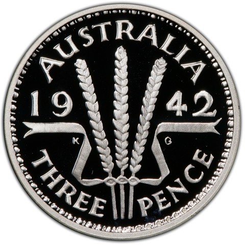The reverse depicts three ears of wheat held by a curved ribbon. Around above, AUSTRALIA; around below, divided into two by the stalks of the wheat, the denomination THREE PENCE; above, across the middle of the coin the date 1942 divided into two by the ears. The designer's initials (K· G·) are tucked, divided, into the first and last bends in the ribbon.