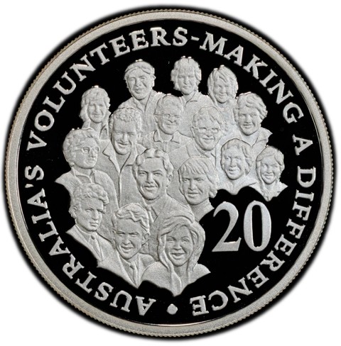 The reverse design features a "kaleidoscope" of volunteers' 16 faces. Around, 20 AUSTRALIA'S VOLUNTEERS - MAKING A DIFFERENCE. In the right field, the denomination 20.
