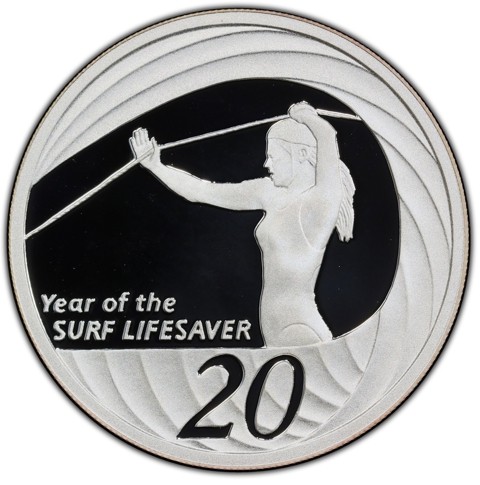 The reverse features a female life saver walking into the surf and working a line. To the left of the figure, in two lines, the text Year of the SURF LIFESAVER. The denomination numeral 20 is below, superimposed on the waves.
