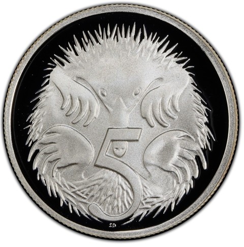 The reverse depicts an echidna (a spiny ant-eater) seen from below as it rolls into a protective ball. The denomination numeral 5 [cents] is above the lower half of the animal, below the numeral in tiny letters initials of designer (SD).