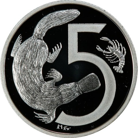The reverse depicts platypus and yabby (an Australian freshwater crustacean). The numeral 5 between the animals. below the numeral the initials letters of designer (AM) and symbol.