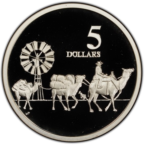 The reverse of the coin bears the image of Camel pack train walking in a linear fashion with a man riding the leading camel followed by others laden with goods across the Australian outback. Behind it on the right, a windmill and a small kangaroo. Above the image, the denomination and the face value "5 DOLLARS" and the designer's initials (WP) below left.