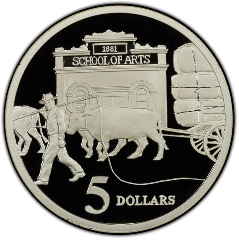 The reverse of the coin bears the image of bullocks pulling a cart which is laden with goods. A man is leading them and they appear to be walking past a building with the sign 1881 School of Arts, The South Australian School of Art (SASA), originally the South Australian School of Design and for some time Adelaide School of Art. Below the image, the denomination and the face value "5 DOLLARS" and the designer's initials (WP) at the right side, above a wheel.