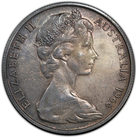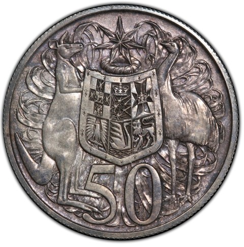 The reverse depicts Coat of Arms of the Commonwealth of Australia, based on those authorized by Royal Warrant 19 September 1912 - composed of a shield divided into six parts, each containing a representation of the badge of a State. The shield is supported by a kangaroo and an emu. The shield sits on the denomination numerals, 50; above the shield is the Federation star. The entire design is set above a field of stylized wattle leaves. Designer's initials "SD" in tiny letters are in the field below the numerals..
