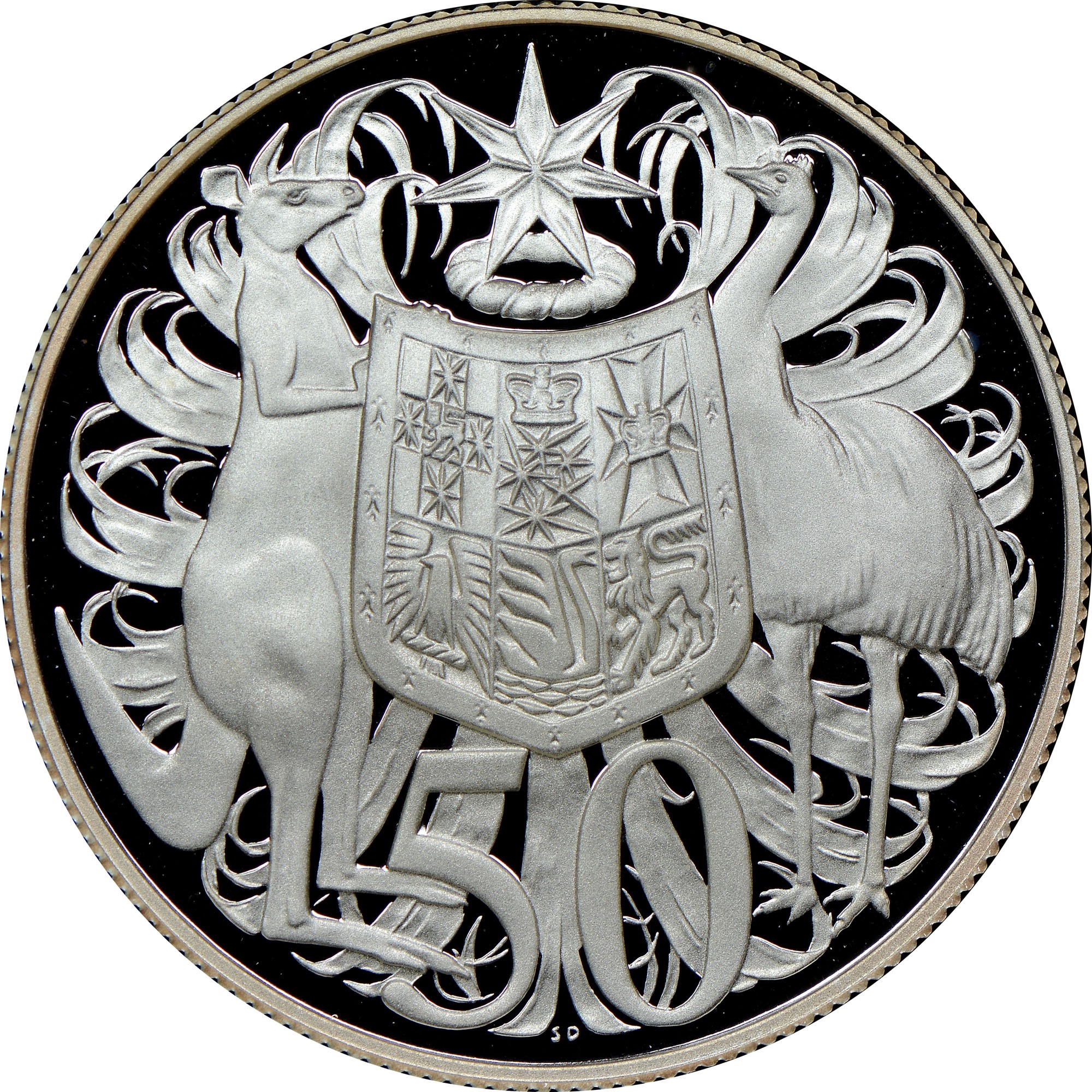 The reverse depicts Coat of Arms of the Commonwealth of Australia, based on those authorized by Royal Warrant 19 September 1912 - composed of a shield divided into six parts, each containing a representation of the badge of a State. The shield is supported by a kangaroo and an emu. The shield sits on the denomination numerals, 50; above the shield is the Federation star. The entire design is set above a field of stylized wattle leaves. Designer's initials "SD" in tiny letters are in the field below the numerals..