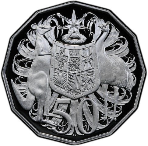The reverse depicts Coat of Arms of the Commonwealth of Australia, based on those authorized by Royal Warrant 19 September 1912 - composed of a shield divided into six parts, each containing a representation of the badge of a State. The shield is supported by a kangaroo and an emu. The shield sits on the denomination numerals, 50; above the shield is the Federation star. The entire design is set above a field of stylized wattle leaves. Designer's initials "SD" in tiny letters are in the field below the numerals..