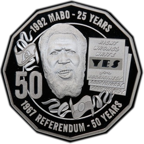 The reverse coin design was created in collaboration with Boneta-Marie Mabo, award-winning contemporary artist and grand-daughter of Eddie Mabo, and features Eddie Mabo as representative of the plaintiffs from the High Court case, the Torres Strait Islander and Australian Aboriginal flags, and iconic pamphlets from the 1967 referendum surrounded by "1992 MABO - 25 YEARS" above; "1967 REFERENDUM - 50 YEARS" below. The face value (50) is to the left of Mabo's portrait.