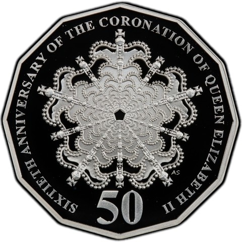 The reverse design features geometric design of St Edwards crowns (60th Anniversary Coronation). legend identify theme :SIXTIETH ANNIVERSARY OF THE CORONATION OF QUEEN ELIZABETH II" around and denomination in the bottom.