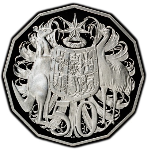 The reverse depicts Coat of Arms of the Commonwealth of Australia, based on those authorized by Royal Warrant 19 September 1912 - composed of a shield divided into six parts, each containing a representation of the badge of a State. The shield is supported by a kangaroo and an emu. The shield sits on the denomination numerals, 50; above the shield is the Federation star. The entire design is set above a field of stylized wattle leaves. Designer's initials "SD" in tiny letters are in the field below the numerals.